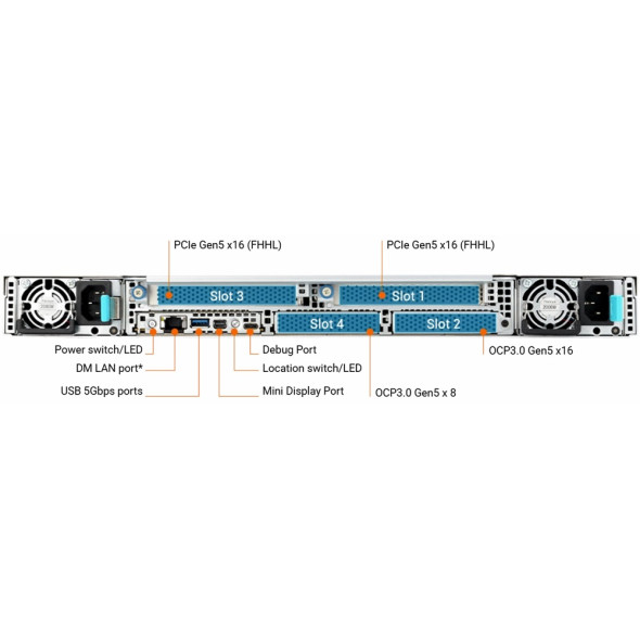 - Vollständig NVMe-basiertes Speicherdesign: Vier PCIe 5.0 Steckplätze (2x OCP 3.0 x16, 2x PCIe 5.0 x16) für skalierbare Hochgeschwindigkeitsnetzwerke und effiziente Datenübertragung