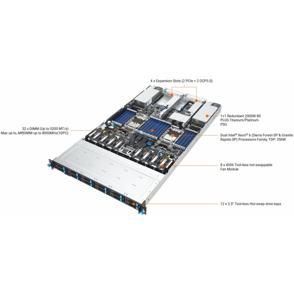 Der ASUS RS700-E12-RS12U ist ein vielseitiger und leistungsstarker 1 HE-Server, angetrieben von zwei Intel® Xeon® 6 Prozessoren. Er unterstützt bis zu 32 DIMMs mit einer maximalen Speicherkapazität von 4.0 TB für gesteigerte Speicherleistung und bietet herausragende Effizienz bei einer Vielzahl von Workloads. Mit seiner modularen und skalierbaren DC-MHS-Architektur ermöglicht der ASUS RS700-E12-RS12U nahtlose Integration und Optimierung und ist damit ideal für moderne Rechenzentren und vielfältige IT-Umgebungen geeignet.