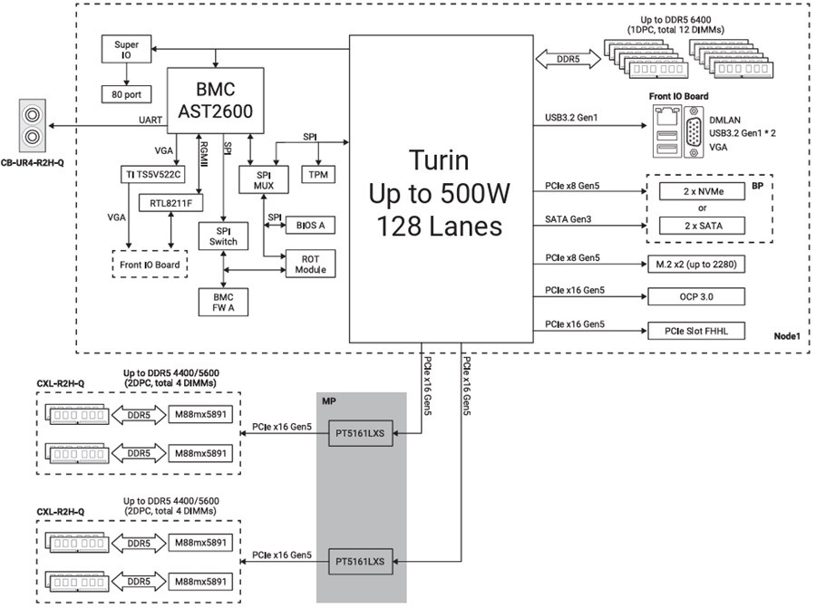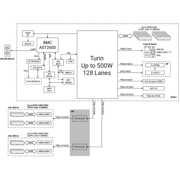 - Hoher Speicherausbau: Optionales CXL-fähiges Design unterstützt acht zusätzliche DIMMs pro Knoten mit 4400 MHz (2DPC) und bietet hohe Kapazität sowie kosteneffiziente Skalierbarkeit.