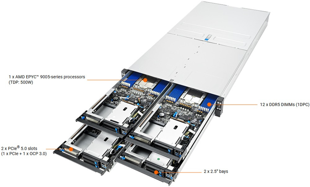 - Starke Leistung: Jeder Node wird angetrieben von einem AMD EPYC™ 9005 Turin-Prozessor mit 12 DIMMs, die bis zu 6400 MHz (1DPC) unterstützen, ausgelegt für hohe Skalierbarkeit, dichte Rechenleistung und vielfältige Workloads.