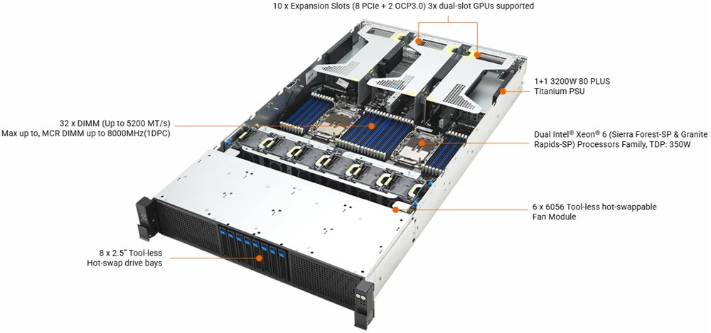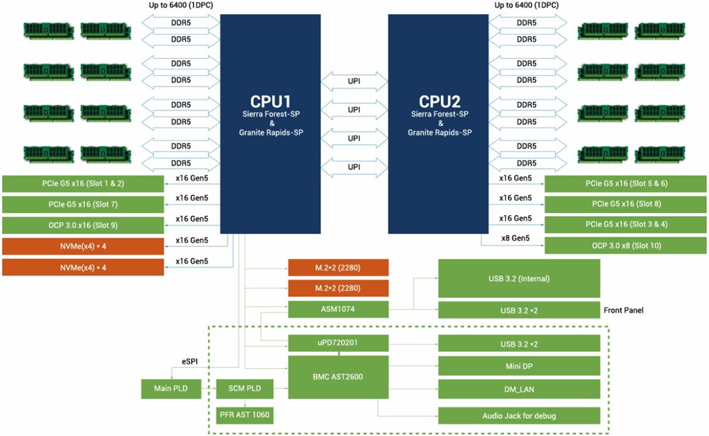 - Umfassende Rechenleistung: Angetrieben von zwei Intel® Xeon® 6 Scalable Prozessoren mit 32 DDR5-RDIMMs bis zu 6400 MHz 1DPC, bietet außergewöhnliche Leistung und maximale Effizienz für das breiteste Spektrum an Workloads.
